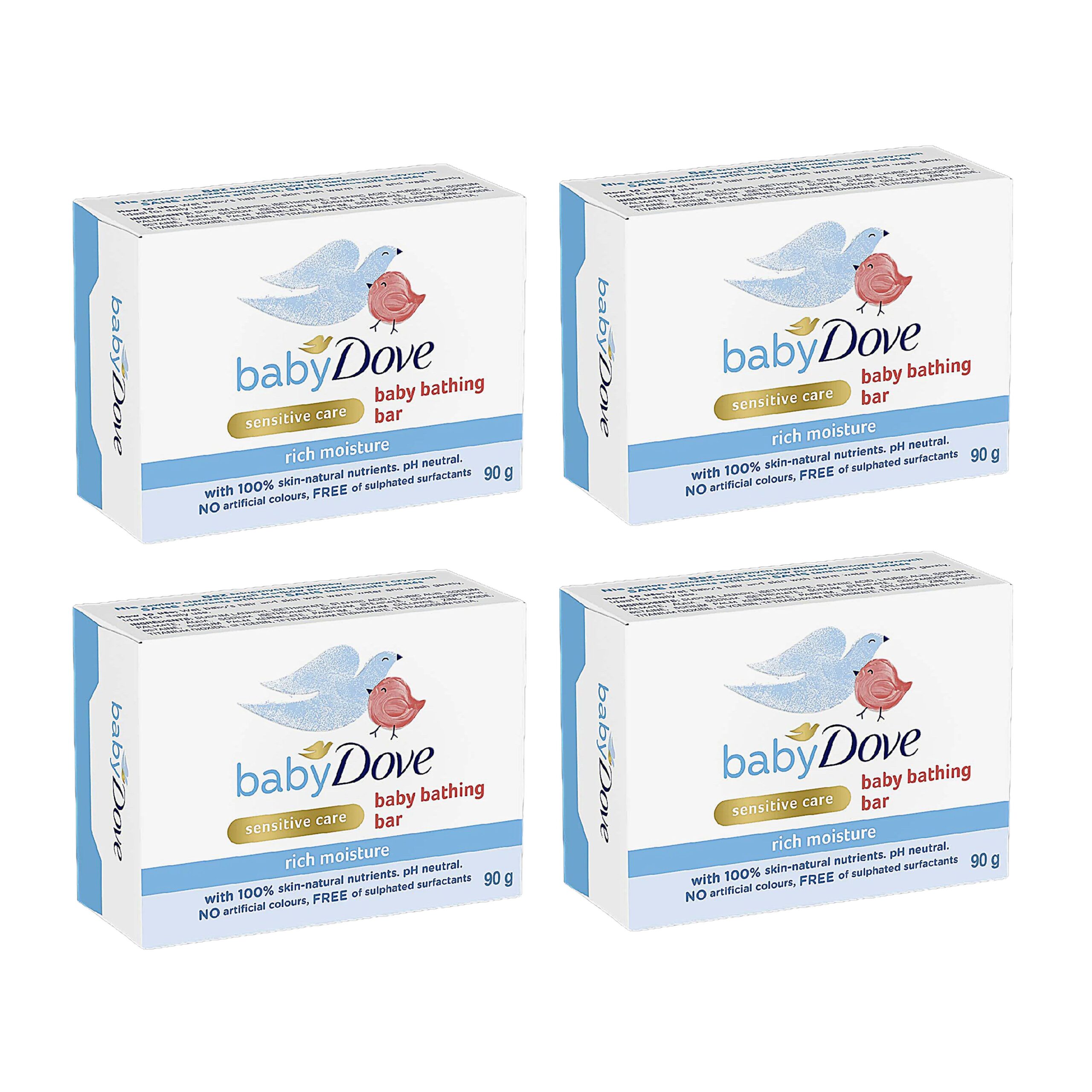This pack contains 4 bars of 90g each, making it perfect for daily use. Dermatologically and paediatrically tested, Dove Baby Bathing Soap is free from harsh chemicals and suitable even for newborns.
