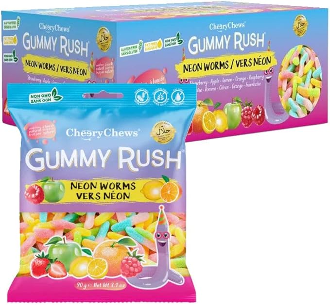 Gummy Rush Neon Worms are vibrant, colorful gummy candies shaped like worms, bursting with a tangy and sweet fruity flavor. Each 90-gram pack delivers a fun, chewy treat perfect for sharing or snacking anytime. Ideal for candy lovers who enjoy a playful twist of neon colors and a deliciously soft texture. The pack of 12 ensures you have plenty to enjoy or share with friends and family.