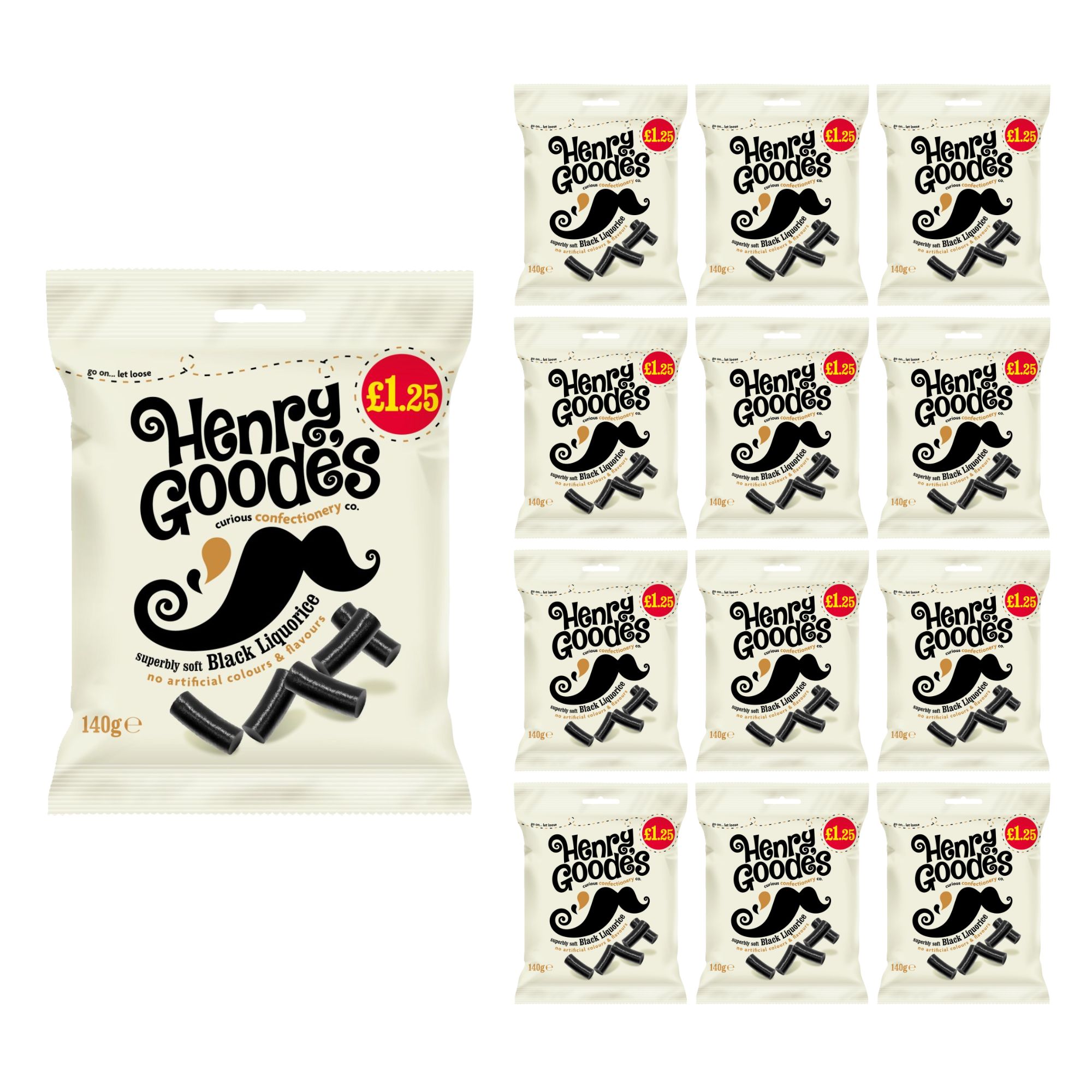 A pack of 12 x 140g Henry Goode’s Superbly Soft Black Liquorice—rich, smooth, and naturally flavoured for a truly classic taste.