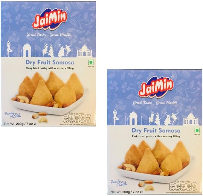 Jaimin Dry Fruit Samosa is a delicious traditional snack made with a crisp, flaky pastry stuffed with a premium mix of dry fruits including cashews, almonds, and raisins. Lightly spiced and delicately sweetened, these samosas are ideal for tea-time enjoyment or festive celebrations. Each pack contains 200g of this delightful treat, and this offer includes 2 packs for double the indulgence. Suitable for vegetarians.