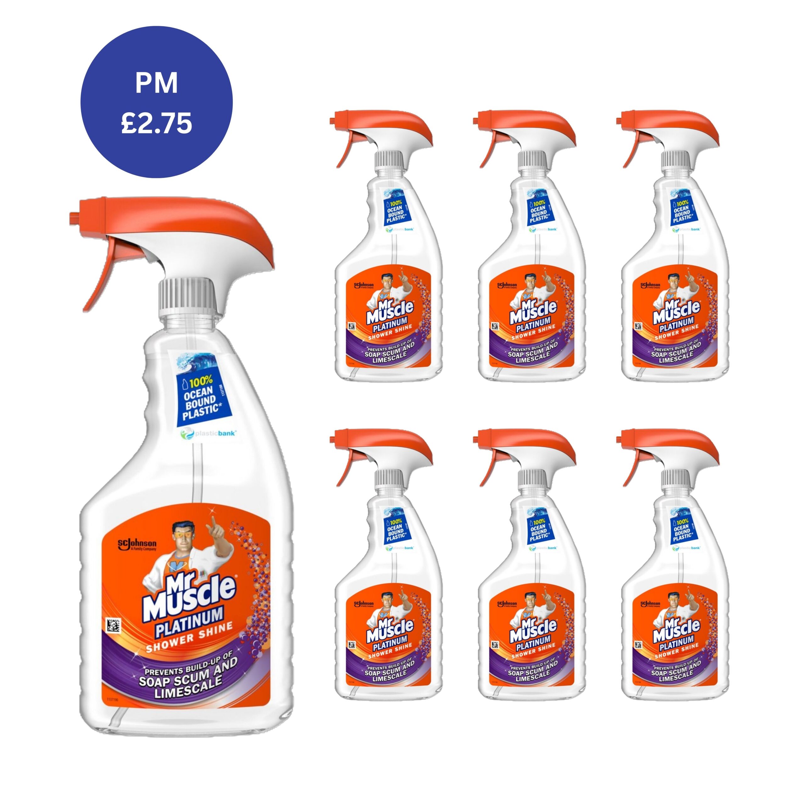 Mr Muscle Platinum Shower Shine 6 x 750ml ? Keeps your shower sparkling clean every day with minimal effort. Prevents limescale, soap scum, and water marks.