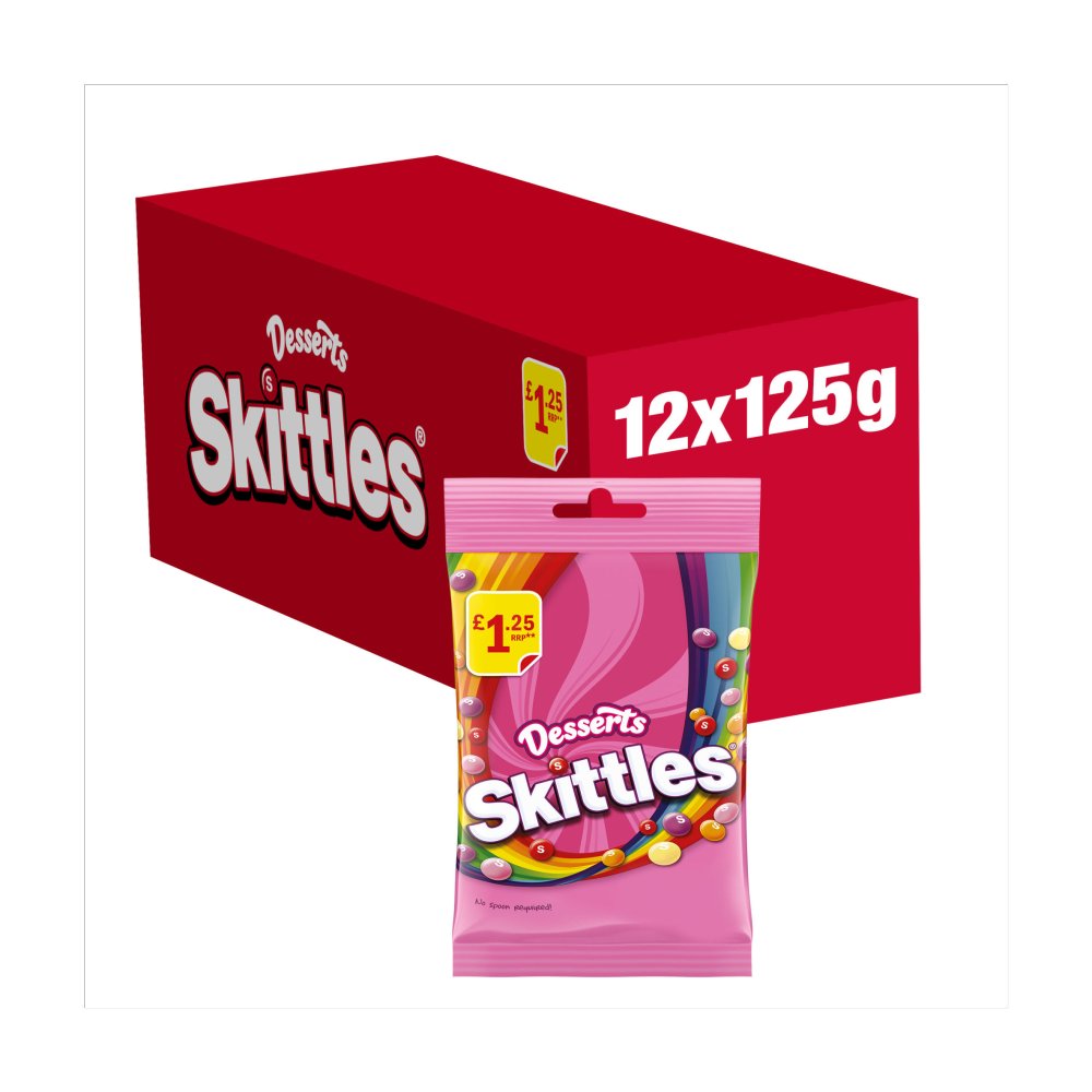Skittles Desserts 125g x 12 — A bulk pack of chewy, colorful candies with delicious dessert-inspired fruit flavors, perfect for snacking and sharing.