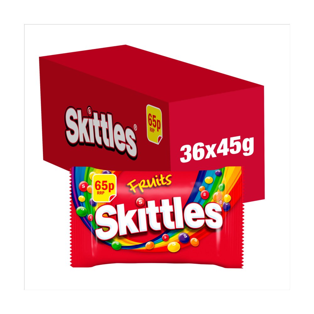 Skittles Vegan Chewy Sweets 45g bags deliver a fruity, chewy treat made with vegan ingredients. This 36-pack is perfect for sharing or snacking anytime.