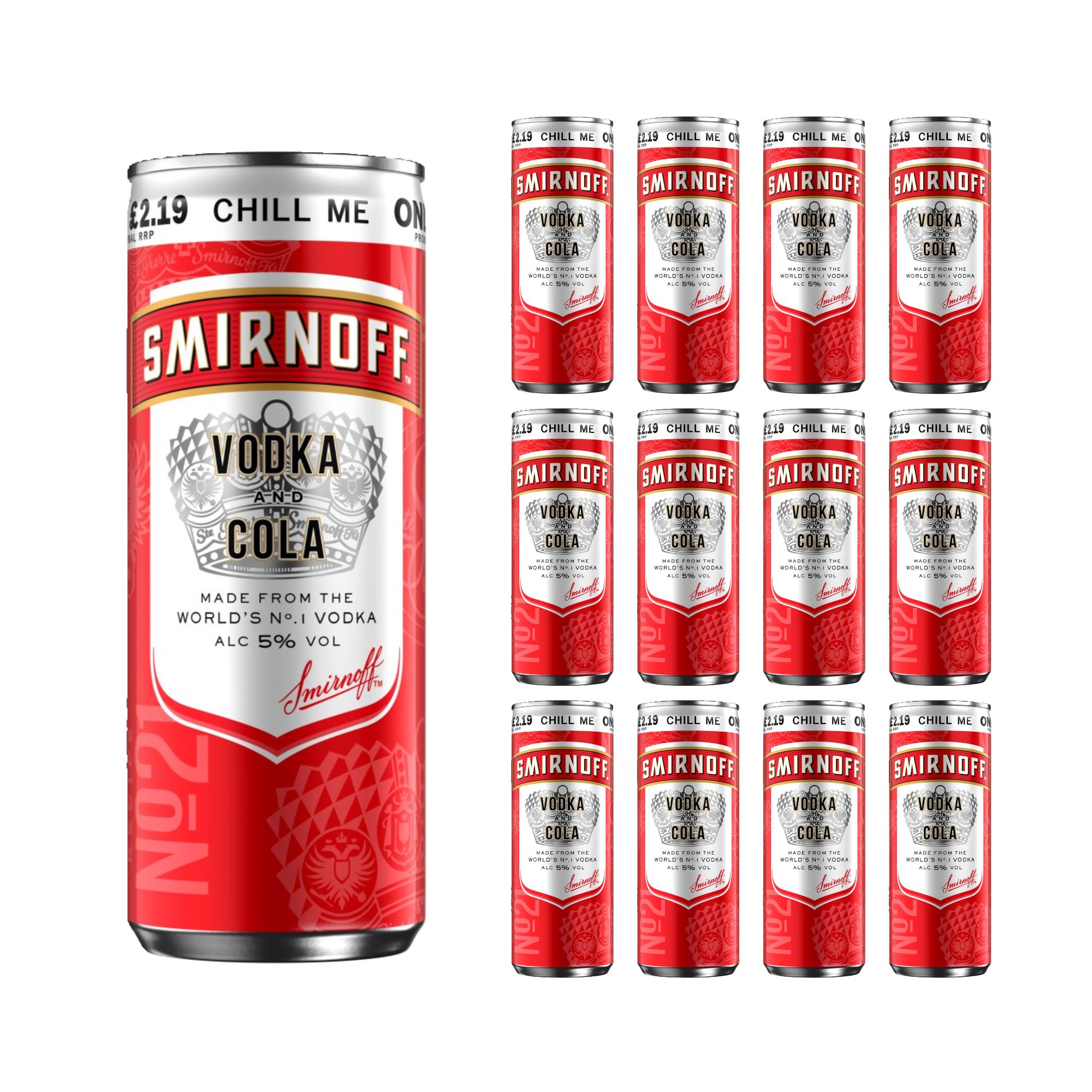 Premixed Smirnoff No.21 Vodka and Cola with 5% ABV in a ready-to-drink 250ml can.